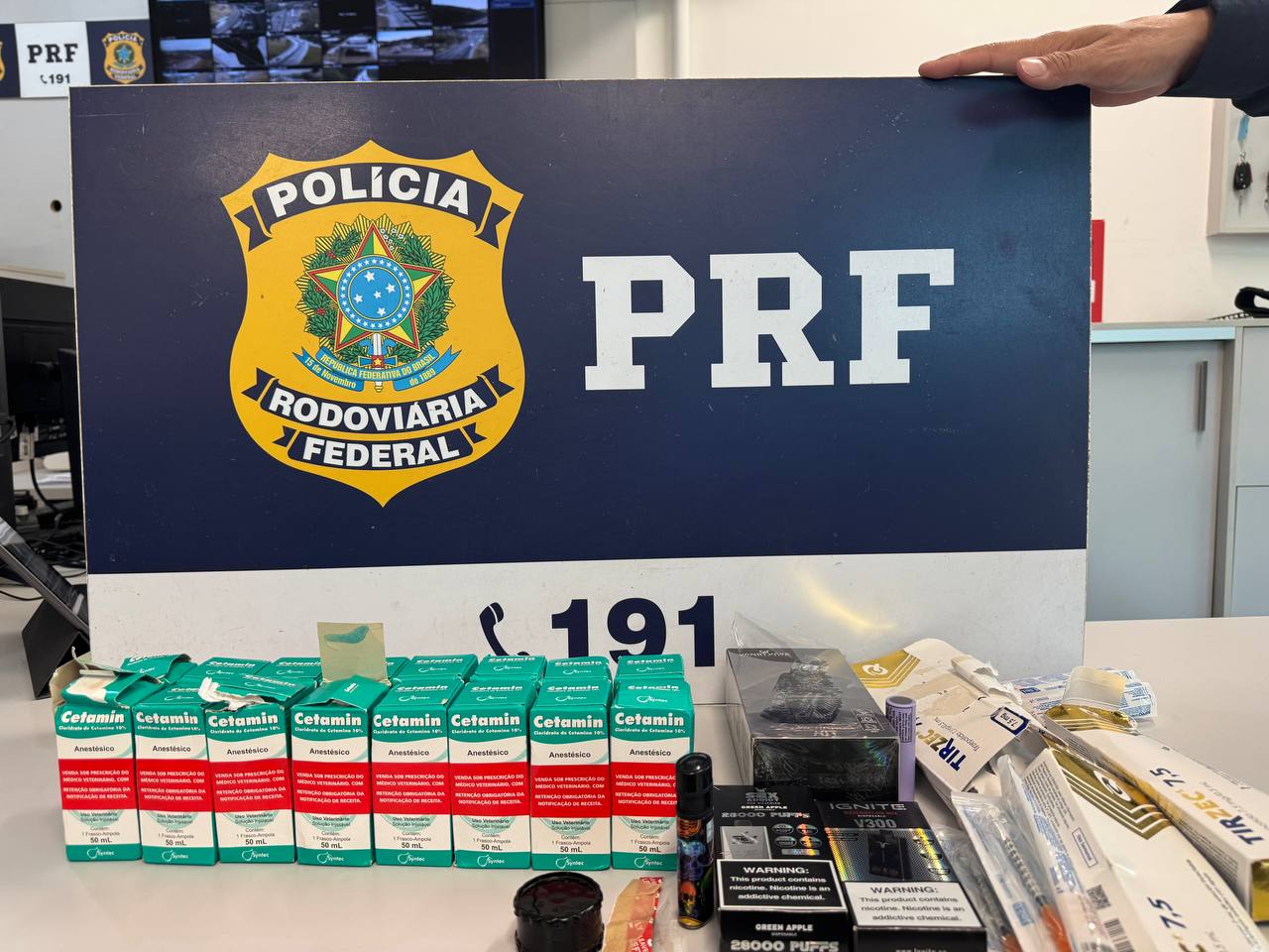 Durante a inspeção, foram encontrados, embaixo do banco do passageiro, 16 frascos de 50 ml cada contendo a substância conhecida como ketamina, totalizando 800 ml. Junto com os frascos, havia também seringas e agulhas, indicando a intenção de uso ou distribuição da droga. A ketamina, embora seja um potente anestésico veterinário para grandes animais, tem sido amplamente utilizada como droga recreativa, com efeitos alucinógenos perigosos à saúde.