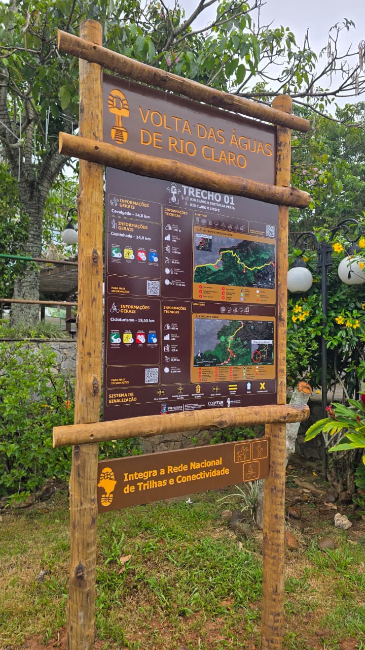 Duas das 17 placas que irão sinalizar os trechos da Trilha Volta das Águas foram instaladas em Rio Claro na segunda, dia 8, e nesta quarta-feira, 10. A primeira na Praça Fagundes Varela, trecho 1. A outra no Guaraná Quente, trecho 2. As placas marcam o início de cada segmento da trilha multimodal de 310,77 quilômetros, considerada a maior de longo curso do Brasil dentro de um único município. Ao todo, são 174 km destinados à cavalgada, 183 km para caminhada, 20 km para canoagem e 171 km para ciclismo.