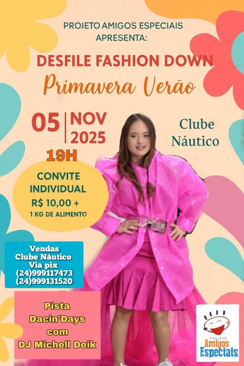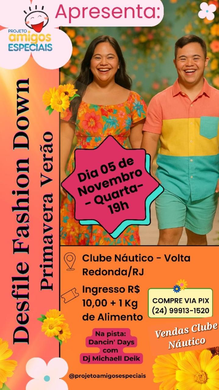 O Projeto Amigos Especiais realiza nesta quarta-feira, dia 5, a partir das 19 horas, o seu desfile anual beneficente no Clube Náutico, em Volta Redonda. Com o tema Primavera/Verão, o evento promete uma noite emocionante, celebrando a inclusão e dando protagonismo às pessoas com Síndrome de Down, que serão as estrelas da passarela.