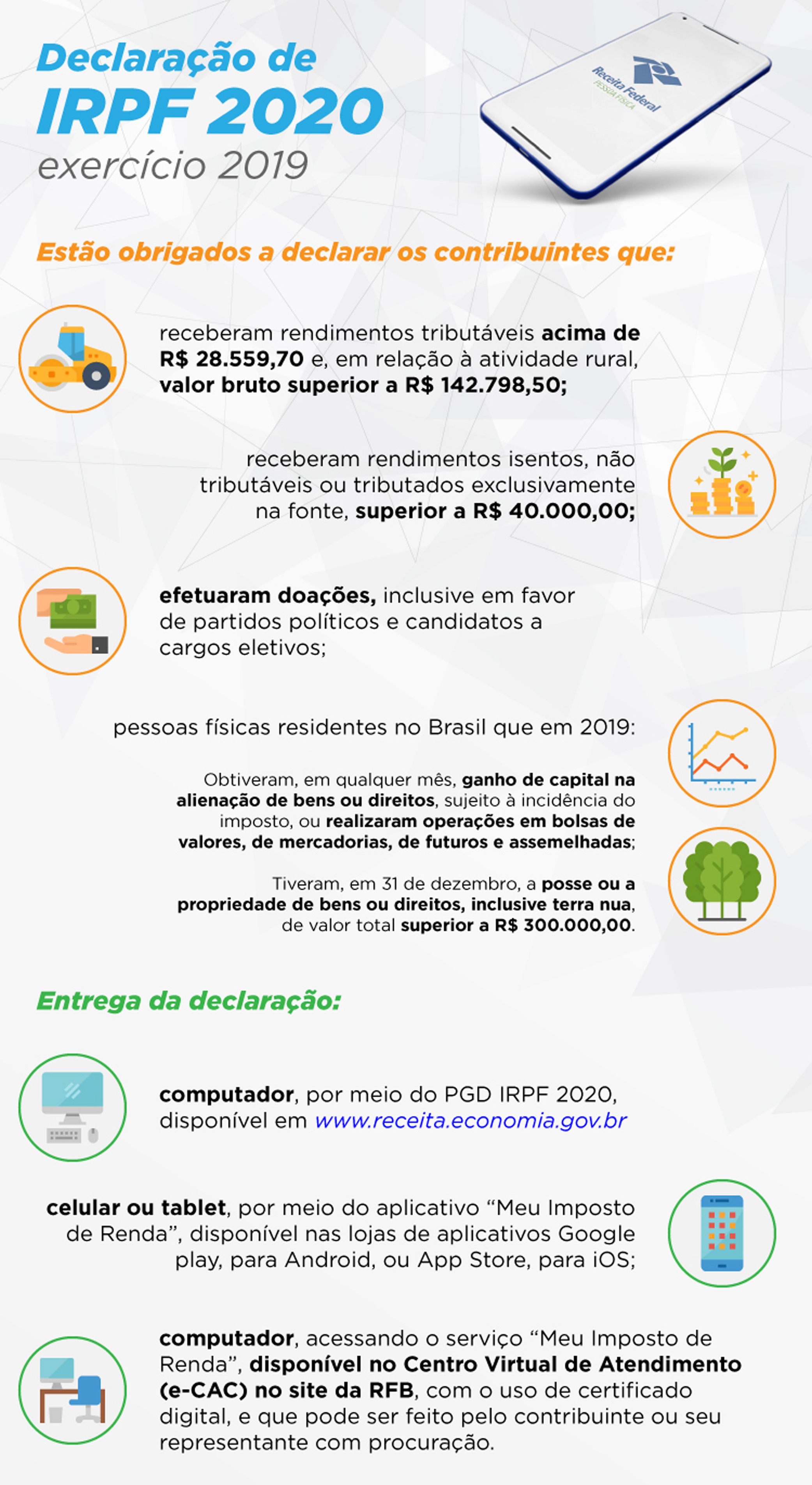 É obrigado a entregar a DIRPF 2020? Quem recebeu rendimentos tributáveis acima de R$ 28.559,70; contribuintes que receberam rendimentos isentos acima de R$ 40 mil; aqueles que tiveram, em qualquer mês do ano passado, ganho de capital na venda de bens ou realizaram operações na Bolsa de Valores; quem optou pela isenção de IR na venda de um imóvel residencial para comprar outro, se as duas transações ocorreram dentro de, no máximo, 180 dias; aqueles que, até o último dia do ano a ser declarado, tinham posses somando mais de R$ 300 mil; pessoas que alcançaram a receita bruta acima de R$ 142.798,50 em atividades rurais; todos aqueles que passaram a morar no Brasil, em qualquer mês do ano passado.