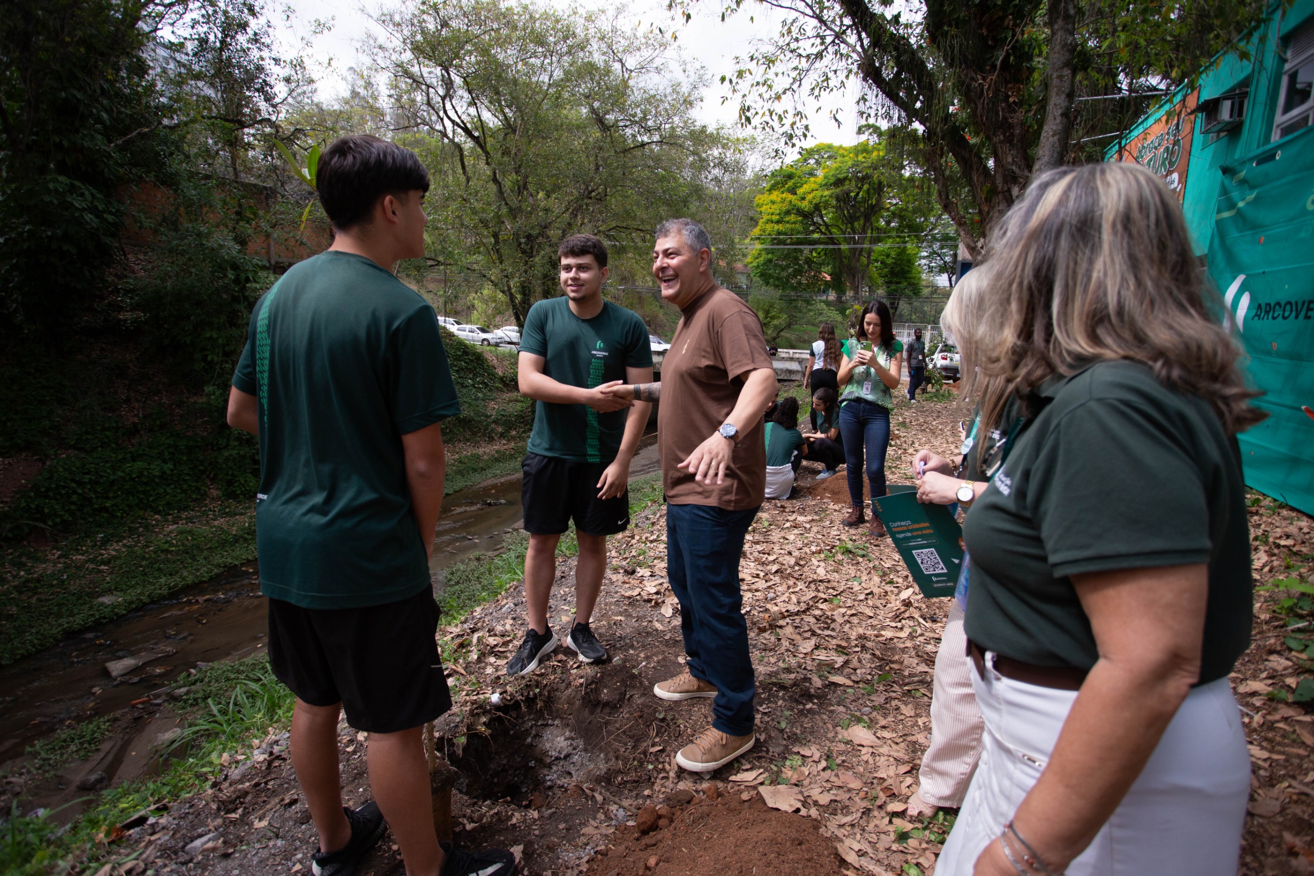 O plantio de 48 mudas de espécies nativas da Mata Atlântica às margens do Córrego Cachoeirinha, que corta a Vila Santa Cecília, marcou o lançamento do Projeto Floresta dos Estudantes, uma parceria da Prefeitura de Volta Redonda, por meio da Secretaria Municipal de Meio Ambiente (SMMA), e a Rede de Educação Arcoverde, através da unidade Macedo Soares. A ação, que envolveu estudantes do 3º ano do Ensino Médio, aconteceu na manhã desta sexta-feira, dia 19, ao lado da escola.