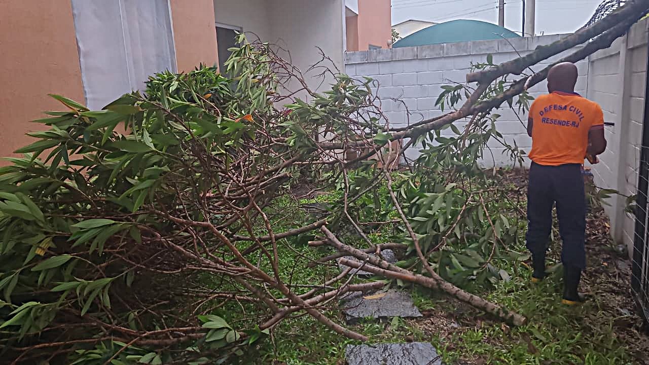 Em Resende, as rajadas de vento chegaram a 73 km/h. Entre as ocorrências atendidas em Resende, houve a queda de uma árvore no bairro Utapuca, na Rua Padre Leon. A árvore foi removida prontamente pela Defesa Civil e não houve registro de acidentes envolvendo pessoas, animais ou veículos. No bairro Morada da Colina, uma árvore caiu obstruindo a calçada destinada à circulação de pedestres. Já na avenida principal do bairro Toyota, na Região a Grande Alegria, foram registrados deslizamentos de terra acompanhados da queda de uma árvore no canal da via, além da queda parcial de um ponto de ônibus. Por medida de segurança, o trecho foi isolado com fita zebrada, e a Superintendência Municipal de Transporte e Trânsito (SUMTRAN) foi acionada para reforçar o isolamento da área.