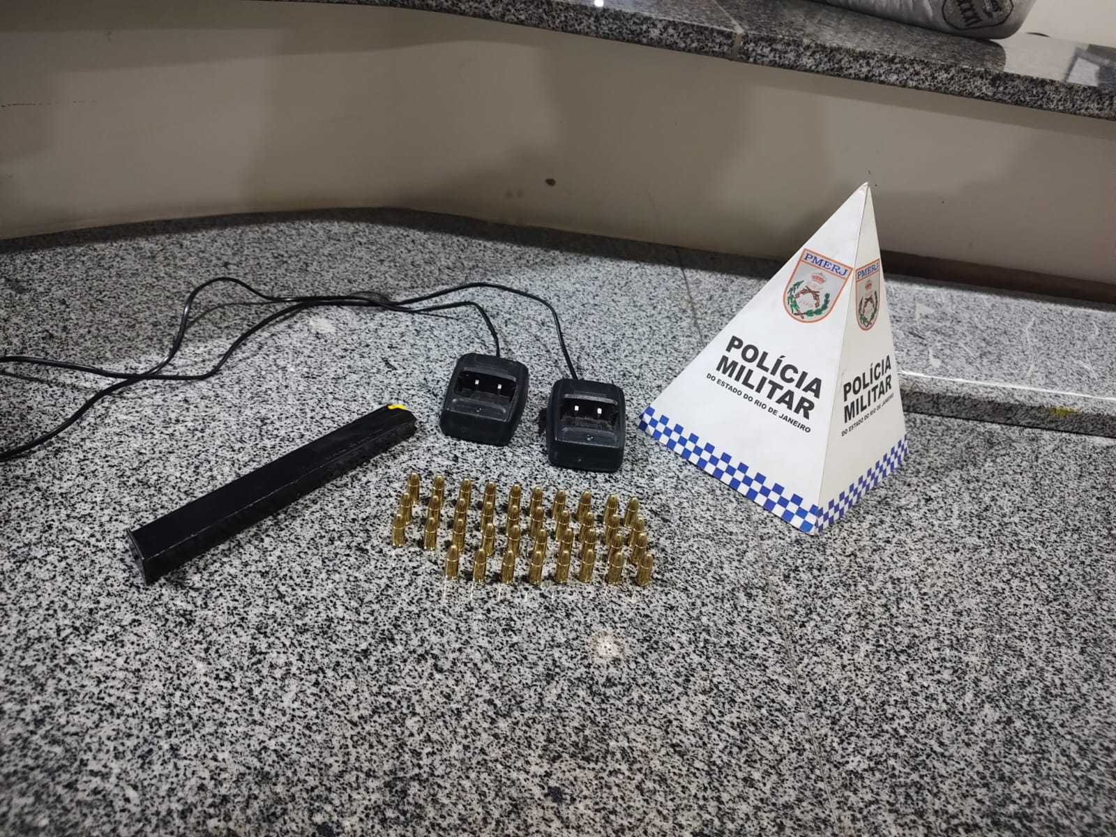 Durante as buscas, os policiais encontraram um carregador artesanal de pistola alongado, municiado com 38 cápsulas de calibre .38, além de sete cápsulas já deflagradas. Em uma residência apontada por populares como ponto de tráfico foram localizadas duas bases de carregadores de rádio transmissor e comprovantes bancários.