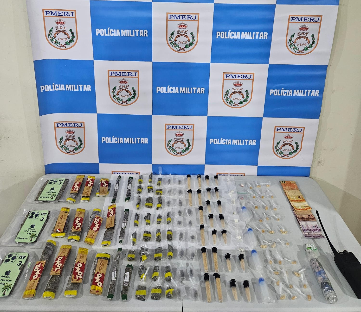 Na mochila, no entanto, os policiais encontraram dez pinos de cocaína de R$ 50, 14 pinos de cocaína de R$ 30, três pedaços de maconha de R$ 100, 11 tiras de maconha de R$ 50, cinco tiras de maconha de R$ 30, 27 tiras de maconha de R$ 20, 18 tambores de skank, nove sementes de haxixe, 30 pedras de crack de R$ 30, dois comprimidos de êxtase, quatro frascos de Loló, um frasco de lança-perfume, além de um rádio transmissor e R$ 60 em dinheiro.