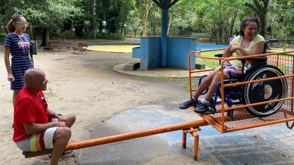 A inclusão acontece também dentro do zoológico. O parquinho das crianças conta com dois brinquedos, um balanço e uma gangorra, adaptados para cadeirantes. Com compartimento de uso exclusivo das Pessoas com Deficiência (PCDs), o objetivo é que as crianças com deficiência brinquem junto com as outras, cada uma do seu lado do equipamento.