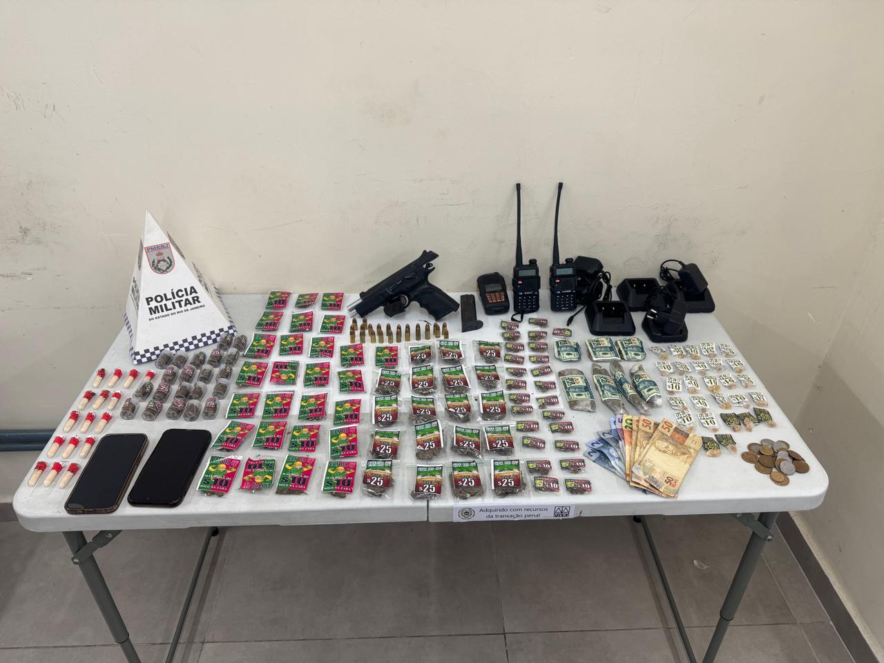 No momento da abordagem, foram apreendidas uma pistola calibre 9 milímetros, dois carregadores compatíveis, munições e entorpecentes que serão contabilizados posteriormente.