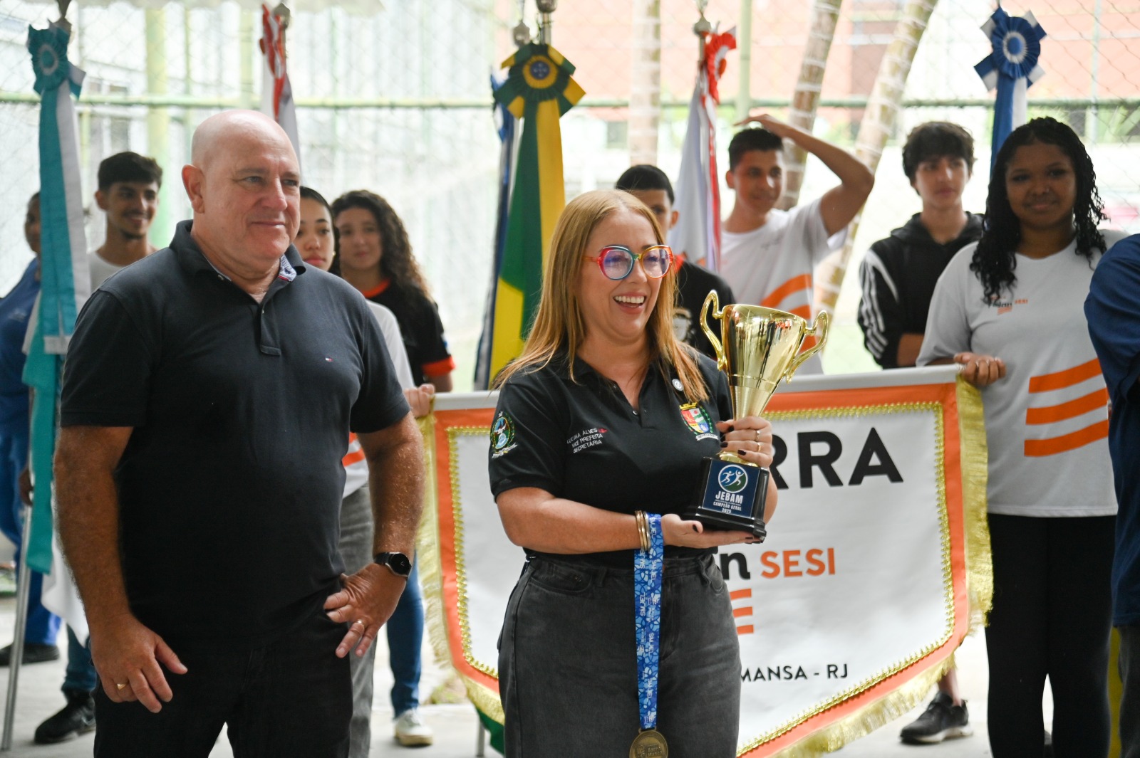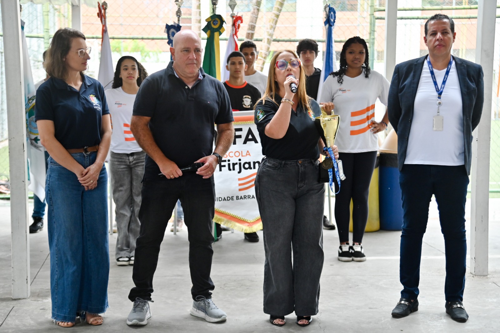 Na solenidade de premiação estiveram presentes a vice-prefeita e secretária da Pessoa com Deficiência, Luciana Alves; o secretário de Esporte, Mário Jorge Ferreira; o diretor da Escola Firjan Sesi em Barra Mansa, Virgílio Lisboa do Val; a assessora do Treinamento Esportivo na Secretaria de Educação, Carolina Sobreira César; a coordenadora da SMJEL, Deviane da Costa, além de estudantes da unidade e a Fanfarra do Sesi.